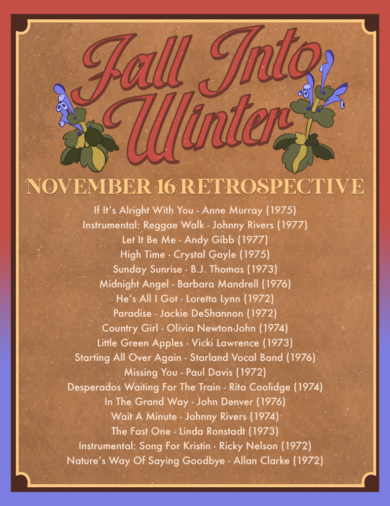 Thank y’all so much for tuning into our third genre special of the year, as well as our third foray into folk and country! We had a lot of fun exploring some of the greats and enjoying the beautiful and vivid writing that they were capable of. Stay tuned for our Record Deep Dive happening next week! I’ll post an update about it very soon! Until then, stay strong this winter!