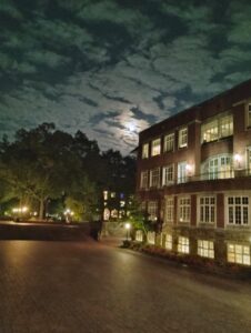 Hello everyone! This time, I was playing songs that I listened to in various times of change in my life, and I think they capture the feelings I was feeling then. The range of genres and types of songs is pretty variable and perhaps they will be new to you. That’s one of my favorite things about DJing, sharing more unknown songs that I’ve heard and enjoy. Hat Trick is tomorrow, and I’m really excited to meet the artists and finally hear live music again! Above is a picture of D.W. Reynolds I took back in my first semester here after getting out of theatre rehearsal.